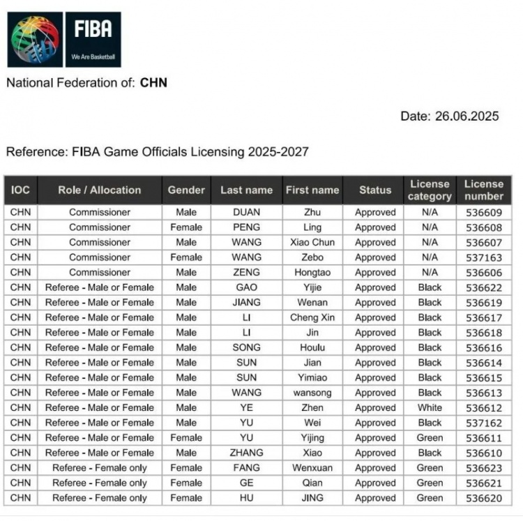 7月2日讯 近日,FIBA正式公布了2025-2027周期全球篮球裁判员及临场代表注册名单。其中,中国共有20位专业人士入选,涵盖临场代表(Commissioner)和裁判员(Referee)两大类别,展现了中国篮球裁判体系的国际化水准。