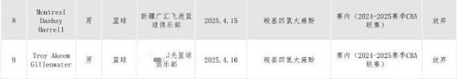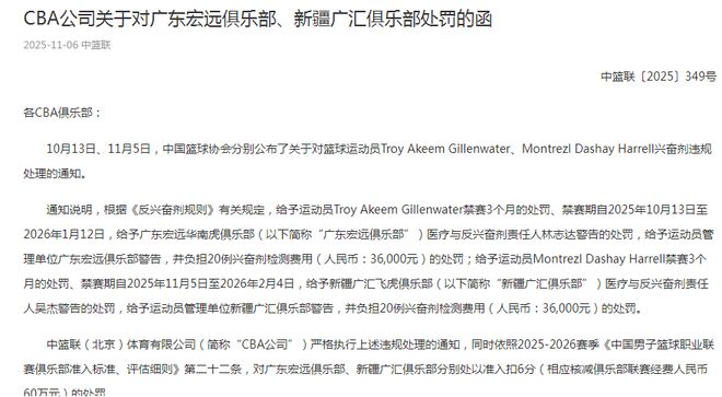 CBA官方:吉伦沃特哈雷尔兴奋剂违规广东新疆扣6分核减经费60万