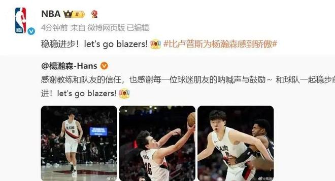 而NBA的官方账号也对杨瀚森送上祝贺,称赞他的表现是“一鸣惊人”“梦幻脚步!