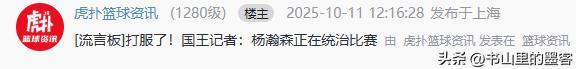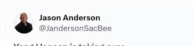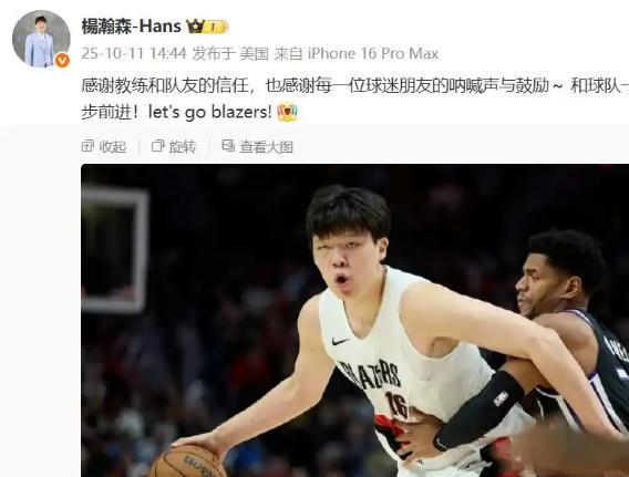 他在自己的社交平台发文:Yang Hansen is taking over(杨瀚森正在统治比赛)。