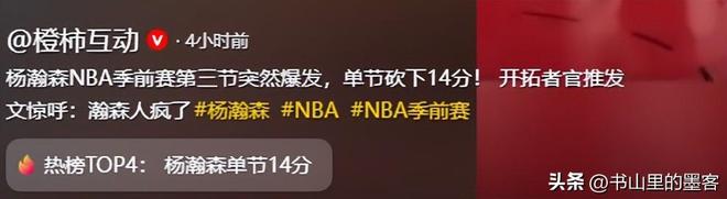 开拓者的第二场季前赛中,杨瀚森出战仅17分钟单人狂砍14分,4篮板1助攻3封盖。