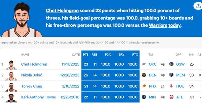 弹无虚发,切特成为NBA历史第4位100%命中率砍20分10板的球员