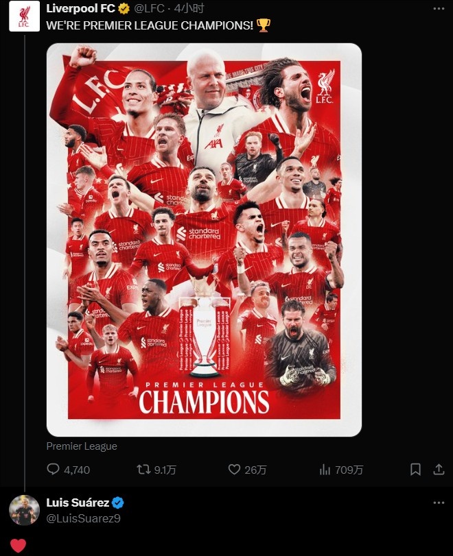 利物浦官方在社交媒体上晒出了夺冠海报,苏亚雷斯也在评论区中以一颗红心进行了回复。