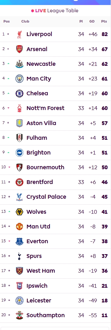 实时积分榜方面,利物浦剩余4轮领先第二阿森纳15分,维持此比分将提前4轮夺冠。