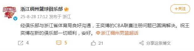 浙江男篮官方写道:“经俱乐部与浙江省体育局良好沟通,王奕博的CBA联赛注册问题已圆满解决。祝王奕博在新的俱乐部一切顺利,安好。”