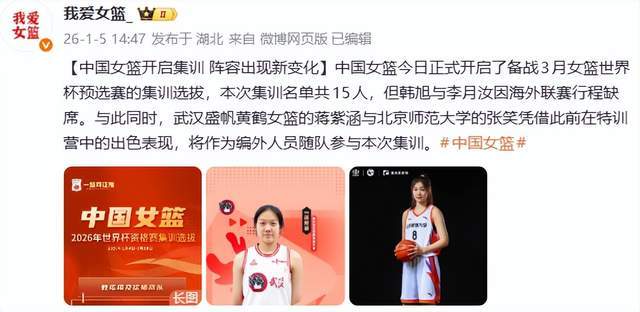 按照中国篮球之队此前发布的消息, 中国女篮于1月5日正式开启集训了,本次集训名单是15人,不过,韩旭和李月汝都在海外联赛,将缺席这一次的集训。