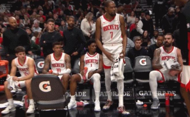 第二场比赛,火箭一度看到赢球的希望。谢泼德的三分手感在这一场有所回暖,而球队在第三节突然爆发,打出了一波34比22的单节高潮,一举将比分拉开到领先13分,带着明显的优势进入末节。所有人都以为,这一次火箭终于能守住领先,止住颓势。然而,杜兰特下场休息的短短两分钟。就在这120秒里,开拓者打出一波11比0的攻击波。火箭其他人完全丧失抵抗能力,没有侵略性,没有对抗,甚至连基本的跑位和传球都显得混乱。眼看着分差迅速被抹平,乌度卡被迫再次把37岁的杜兰特推回场上。