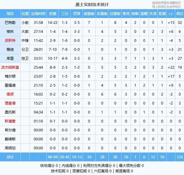 巴特勒32分8板4助2断、库里27分3板7助、穆迪21分1板、波杰姆斯基19分5板2助2断、格林6分5板3助、霍福德5分5板5助2帽、梅尔顿5分2板2助2帽、波斯特5分2板