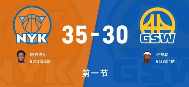 比赛开始客队先攻,麦克布莱德三分第一投就有,回过来穆迪外线潇洒回应双方3-3开局。尼克斯连续前场篮板,布里奇斯三分,阿奴诺比暴扣8-3建立5分优势,库里三分首次出手打铁,哈特转换上篮造成格林犯规两罚全中分差来到7分,尼克斯开场进攻打得很顺。库里格林二人转失误球权交换,麦克布莱德高难度三分还有,巴特勒杀入内线打破得分荒,回过来勇士内线又漏人,哈特轻松上篮15-5科尔喊出暂停。重新比赛穆迪三分止血,但回过来唐斯就是外线回应,穆迪二次进攻三分还中状态真不错,布里奇斯中距离把握住,哈特造成犯规两罚一中21-11,双方开启轮换!库里无球掩护出来三分还是没有,首节中段库里打成2+1无奈失误太多了,沙梅特、阿奴诺比连续三分分差17分,桑德斯三分、库里上篮、巴特勒连得7分追到28-33。最后一分钟双方各得2分,比分定格35-30!