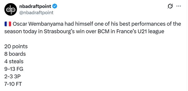 在今日法国U21联赛斯特拉斯堡队战胜BCM的比赛中,文班亚马的弟弟奥斯卡-文班亚马表现出色,全场得到20分8篮板4抢断,投篮13中9,三分3中2,罚球10中7。奥斯卡现年18岁,目前身高已经达到2米03,他将有资格在今年参加NBA选秀。他是一名全能型的前锋。