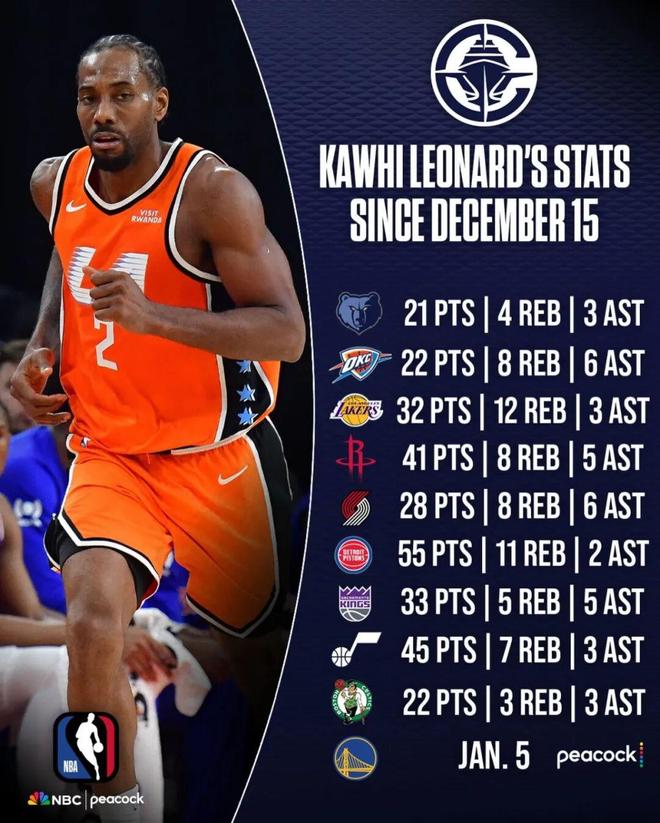 这应该是伦纳德生涯进攻最强的一段时间了,在此之前一共只拿过8次40+的他,在这13场比赛里打出了3次40+,分别是对阵火箭的单场41分(时隔两年的第一次40+)、对阵活塞的单场55分(生涯第一次50+)、对阵爵士的45分(追平生涯第二高分)。