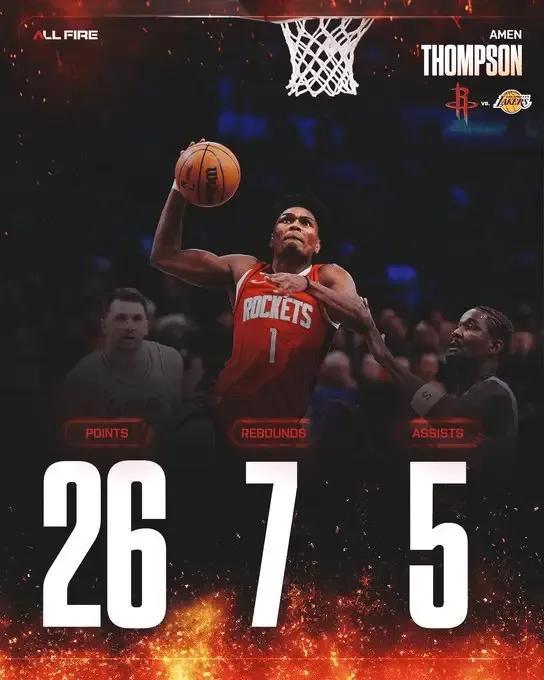 本场比赛对阵湖人,正是阿门的爆发之夜。他出战31分钟,19投12中,虽然三分球2投0中,罚球3投2中,但仍高效砍下26分外加7篮板5助攻1抢断的全面数据。这26分不仅是全队最高,也成为火箭取胜的关键。火箭从开局就掌控节奏,全场领先,从未给湖人翻盘机会。球队在内线优势明显,篮板碾压对手,转换进攻流畅,阿门的冲击力和终结能力在禁区屡屡得手。他的持球空切和冲击内线堪称顶级,多次强硬上篮得手,让湖人防线疲于应对。