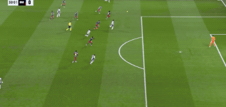 第37分钟,巴萨获得了前场任意球,拉菲尼亚传中,费兰·托雷斯跑得太快,不得不后仰头球攻门,皮球顶偏。