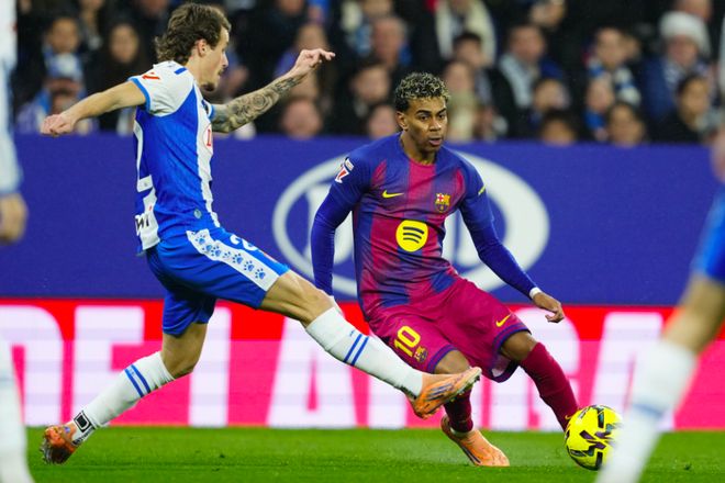 第28分钟,接到埃里克·加西亚的传球,亚马尔上演马赛回旋,轻松晃过后卫,之后的似传似射没能命中目标。